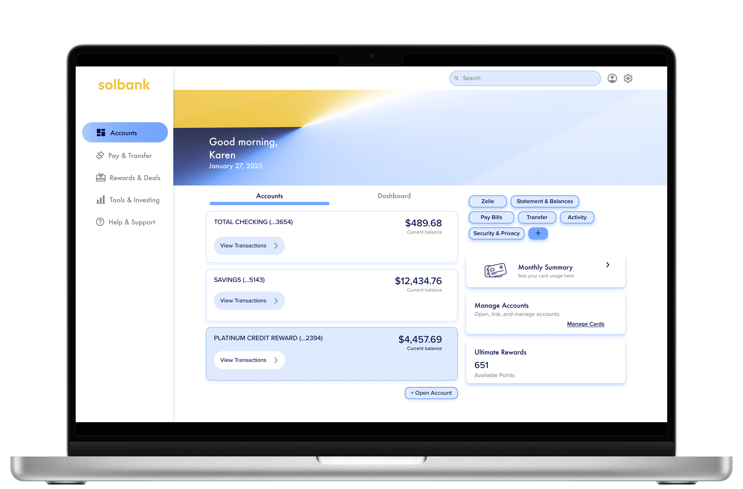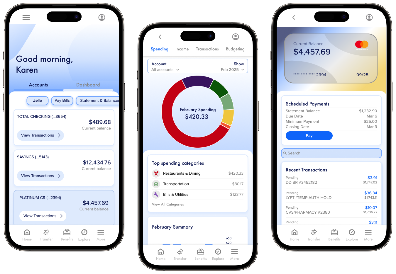 Accounts Overview: A centralized hub displaying all accounts (current, savings, joint), offering quick navigation and financial snapshots.